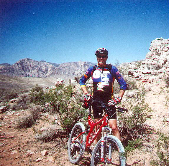 | April School Vacation 2003. Todd, Colt, Steve, and Dave. Five Days of Rides, 17-25 miles each. Highlights: Puke Hill, Satan's Escalator, 3 Mile Smile, Cottonwood NORBA Loop, Grape Ape, Black Velvet, Spanish Trail, & loop from Yucca Tree to Blue Diamond. Best Buffet: Bellagio (unanimous) Freaky Moment: Near whiteout snow conditons in Red Rock Canyon! Quote of the Week: "I thought we were going to die!" (Steve) |